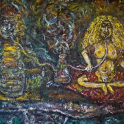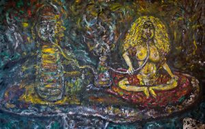 Alice with hookah smoking caterpillar. Wall painting in oil, on wood panel.